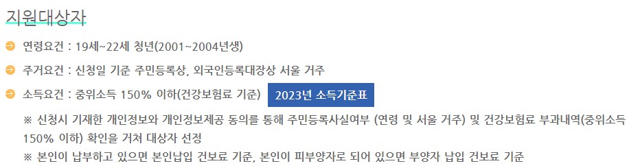 기타정보 | * 신청시 기재한 개인정보와 개인정보제공 동의를 통해 주민등록사실여부(연령, 서울거주) 및 건강보험료 부과내역(중위소득 참고) 확인을 거쳐 대상자를 선정합니다. * 본인이 납부하고 있으면 본인 납입 건강보험료 기준! 본인이 피부양자로 되어있다면 부양자 납입 건강보험료 기준! |