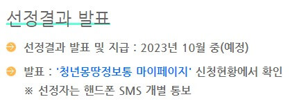 선정결과 | 2023년 10월중 예정 - 청년몽땅정보통 마이페이지에서 확인 가능!! |