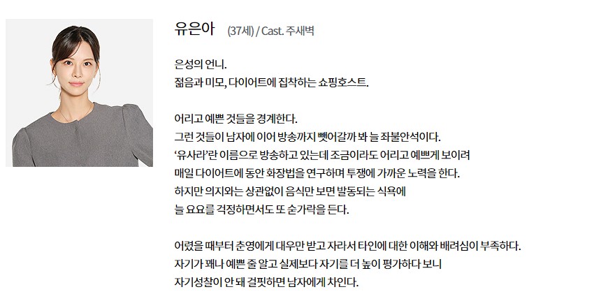 은성의 언니 쇼핑호스트 유은아 역을 맡은 배우 주새벽