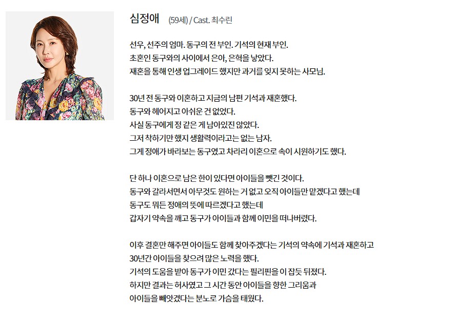선우, 선주의 엄마, 동구의 전부인 기석의 현재 부인 심정액 역을 맡은 배우 최수린