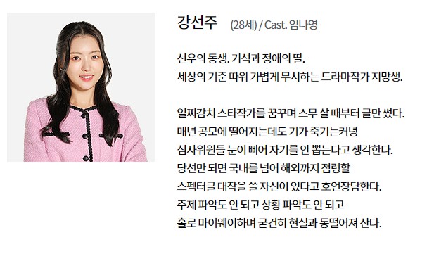 선우의 동생, 기석과 정애의 딸, 드라마 작가 지망생 강선주 역을 맡은 배우 임나영