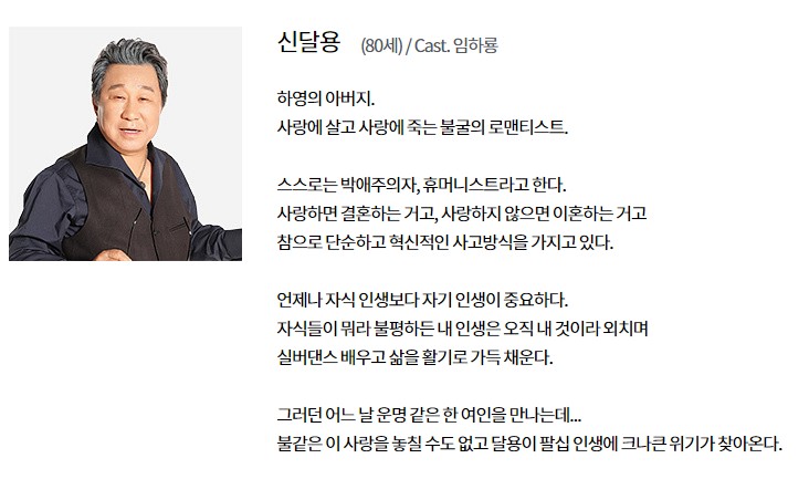 하영의 아버지, 사랑에 살고 사랑에 죽는 신달용 역을 맡은 배우 임하룡