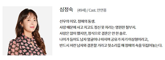 선우의 이모, 정애의 동생 철부지 같은 캐릭터 심정숙 역을 맡은 배우 안연홍