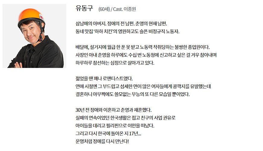 삼남배의 아버지이자 정애의 전남편, 춘영의 현재 남편의 유동구 역할을 맡은 배우 이종원