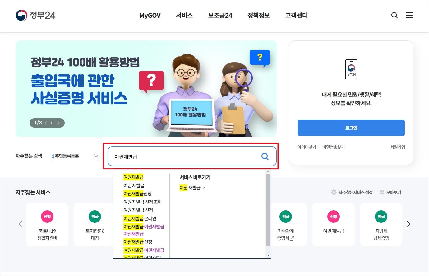 1. 정부24에 접속해서 "여권재발급"을 검색하세요!